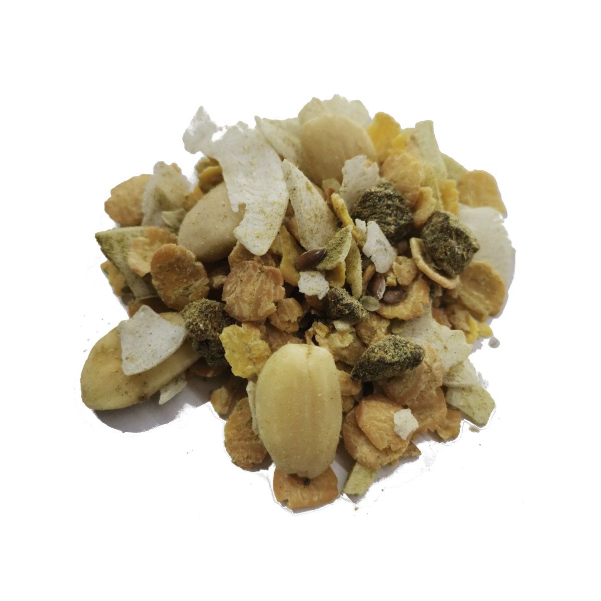 Ingrediënten: haver-, tarwe-, gerstvlokken, rozijnen, krenten, amandelen, gebroken hazelnoten, walnoten, cashewnoten, kokosvlokjes, pompoenpitten, zonnebloempitten, moerbeibessen, vijgenstukjes, abrikozenstukjes, dadelstukjes, lijnzaad, chiazaad.